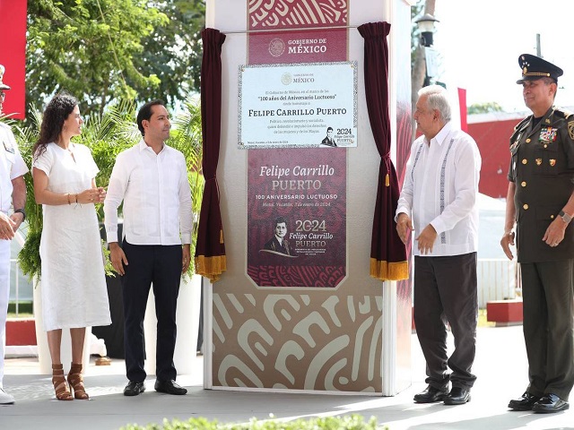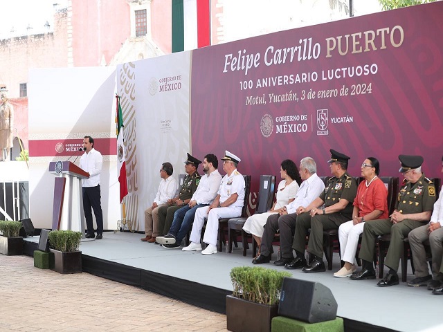 Motul, Yucatán 3 de enero de 2024.- Al conmemorar el 100 aniversario luctuoso de Felipe Carrillo Puerto, junto al Presidente Andrés Manuel López Obrador, el Gobernador Mauricio Vila Dosal reiteró que en Yucatán continuarán luchando por los derechos de todas y todos, donde la justicia social sea el pilar de nuestro desarrollo y donde cada yucateco pueda vivir con dignidad y esperanza.Desde Motul, tierra de Felipe Carrillo Puerto, Vila Dosal aseveró que en el Gobierno de Yucatán velaremos siempre por mantener una política social justa y en beneficio de quienes más lo necesitan.“Hoy, mientras honramos su memoria, reafirmamos nuestro compromiso de seguir construyendo el Yucatán que él soñó”, subrayó ante el almirante Juan José Padilla Olmos, jefe del Estado Mayor de la Armada de México.En ese sentido, Vila Dosal rememoró el legado que Felipe Carrillo dejó y sirvió para sentar las bases de un mejor Yucatán. “Esto lo digo porque gracias a su visión, dedicación y esfuerzo, fue un hombre de instituciones y reformas que lograron hacer cambios profundos en beneficio de quienes menos tienen. También, no podemos dejar de lado que luchó siempre por la igualdad de los pueblos mayas, y que también, fue un importante impulsor de la economía y la agricultura en el estado”.Tras la develación de la placa conmemorativa al 100 aniversario luctuoso de Felipe Carrillo Puerto, el Gobernador recordó que su administración ha hecho equipo con los distintos órdenes de gobierno para trabajar en diversos proyectos que materialicen la visión de Carrillo Puerto. Tal como el proyecto de la Ampliación del Puerto de Altura de Progreso, que se realiza en conjunto con la Secretaría de Marina (SEMAR); en materia energética y de la mano de la Comisión Federal de Electricidad (CFE) se trabaja para dar sostenibilidad energética a la Península con la construcción de dos nuevas Plantas de Ciclo Combinado; además del Tren Maya que va a conectar la Península y crear oportunidades reales de desarrollo y crecimiento parejo.En presencia de las titulares de la Secretarías de Gobernación (Segob), Luisa María Alcalde y de Seguridad y Protección Ciudadana, Rosa Icela Rodríguez Velázquez, el Gobernador precisó que estos son algunos de los proyectos que estamos impulsando en equipo con el Gobierno Federal y los cuales dan la certeza y confianza de que cuando todos compartimos el mismo fin, podemos llevar a cabo grandes resultados.Ante el alcalde anfitrión, Roger Rafael Aguilar Arroyo, Vila Dosal destacó que, gracias al trabajo coordinado, tenemos el salario promedio más alto en la historia de Yucatán; el ingreso de las familias yucatecas creció 11%; el 10% de la población más pobre su salario a nivel nacional en promedio creció 17%, en Yucatán creció 44%. Además, 236,000 yucatecas y yucatecos salieron de la pobreza.Al dirigir un mensaje, el Presidente Andrés Manuel hizo una remembranza de los personajes históricos e ilustres que cada año ha reconocido su Gobierno empezando en 2019 con Emiliano Zapata; 2020, Leona Vicario; 2021, Quetzalcóatl; 2022, Ricardo Flores Magón; 2023; Francisco Villa y el 2024 será el año dedicado a reconocer el legado de Felipe Carrillo Puerto. El primer mandatario recordó que ya se ha empezado a reconocer el legado del también conocido como Apóstol Rojo, pues el nuevo aeropuerto de Tulum, lleva el nombre de Felipe Carrillo Puerto y agregó que en breve comenzarán a circular publicaciones dedicadas a reconocer el legado de este personaje. Al reiterar su aprecio hacia el pueblo de Yucatán, López Obrador afirmó que tal y como dice el Gobernador Mauricio Vila no se trata de pelearnos, no podemos estar como banderillas partidistas, sino se debe gobernar para todos en beneficio del pueblo.“Por eso trabajamos juntos y lo vamos a seguir haciendo, en obras para el desarrollo de Yucatán. Obras muy importantes que nunca se habían llevado a cabo de Yucatán y los programas sociales que van a continuar en beneficio de todo el pueblo”, concluyó. Navegación de entradasLa iglesia católica pide emitir un voto libre y consensuado en la próxima jornada electoral Últimos días en Kanasín de “La Carpa de los Sueños”