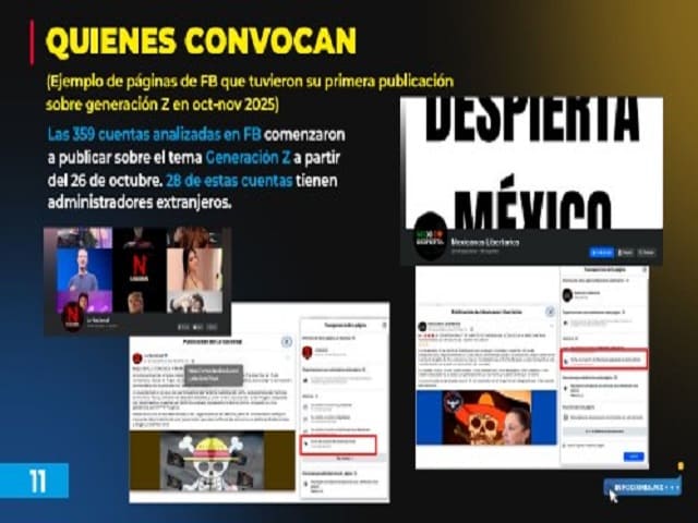 Por Dalila Escobar Jueves, 13 de noviembre de 2025 CIUDAD DE MÉXICO (apro).- El gobierno federal hizo una presentación sobre quienes considera están detrás de la manifestación del 15 de noviembre, a la que la presidenta Claudia Sheinbaum llama la “marcha de la derecha” internacional y en México apuntaron a Ricardo Salinas Pliego. Se presentó como un “análisis digital” y fue un recuento de las publicaciones que han compartido algunas cuentas de X que han referido el tema de la protesta. “Se demostrará que se trata de una convocatoria inorgánica, pagada, con la participación de la derecha internacional, con cuentas de redes sociales operadas desde el extranjero, generadas en el momento y con otras cuentas que apoyaron a la oposición y que participaron en las campañas de mentiras con las narcoetiquetas en 2024”, dijo Miguel Elorza, coordinador de Infodemia. El funcionario dijo que “se evidenciará cómo panistas, priistas y hasta el empresario Ricardo Salinas Pliego han utilizado a la Generación Z y se han —hay que decirlo— montado en esta campaña”. Expuso como origen de la convocatoria “el 3 de octubre, Azteca Noticias hizo un reportaje donde mencionó que ‘las manifestaciones de la Generación Z son una protesta global’, lo que no corresponde con la realidad”. Después de que se dio a conocer la convocatoria de la marcha, el 15 de noviembre, expuso, “se detectaron 179 cuentas en TikTok y 359 comunidades en Facebook que comenzaron a impulsar la información de Generación Z de manera sincronizada”. Concluyó que “50 de las 179 cuentas de TikTok tuvieron su primer posteo en octubre o noviembre, lo que nos dice que fueron creadas exprofeso para mover de manera simultánea este tema”. Expuso como ejemplos algunas de las 28 páginas que tienen administradores de otro país como España, Bolivia, Estados Unidos y Bolivia. “Algunas de las figuras de los panistas que han impulsado esta marcha, que se dice que ‘es apartidista’: Vicente Fox, es uno de los que más ha impulsado esta marcha. Claudio X. González, que tiene la relación con ‘Salvemos la democracia’ y la ‘Marea Rosa’. Sociedad Civil, que retuitea posteos de ‘Salvemos la democracia’ y de la ‘Marea Rosa’ y de Claudio X. González, y de Fox. Y Acción Civil Mexicana”. El presentador de la sección “el detector de mentiras”, dijo que “a partir de diversos análisis, se calcula que el gasto en esta estrategia digital asciende a más de 90 millones de pesos, solo en octubre y en lo que va de noviembre”. La parte de la ciudadanía que va a participar en esta marcha ha expuesto que acuden para protestar por la violencia que se vive en el país, con grupos del crimen organizado que mantienen en especial la extorsión y cobro de piso. Un caso fue el asesinato del presidente municipal de Uruapan, Carlos Manzo, que se dio en la conmemoración de Día de Muertos en un evento público, mientras estaba rodeado de su familia. Navegación de entradasCasinos y lavado de dinero: Revelan red que usa a estudiantes, jubilados y amas de casa Harfuch se reúne con Grecia Quiroz en Michoacán; Gabinete de Seguridad recorre Urupan