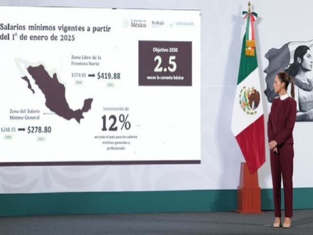 Durante la conferencia matutina de este miércoles 4 de diciembre, Marath Baruch Bolaños López, secretario del Trabajo y Previsión Social, informó que el incremento se logró después de platicar y llegar a un acuerdo con empresarios del país.“Por consenso unánime, se decreta el incremento del 12 por ciento a los salarios mínimos en todo el país que entrará en vigor a partir del 1 de enero de 2025″, detalló.El funcionario explicó que el incremento al salario mínimo del 12 por ciento se aplicará en todo el país para los sueldos generales y profesionales, por lo que con esta medida, destacó, se cumple con el compromiso número 56 de los 100 compromisos escritos en el Segundo Piso de la Transformación.De acuerdo con el Gobierno mexicano, con el incremento del 12 por ciento, el salario mínimo queda de la siguiente forma:Zona libre de la frontera norte: Pasa de 374.89 pesos a 419.88 pesos (44.99 pesos más)Zona del salario mínimo general: Pasa de 248.93 pesos a 278.80 pesos (29.87 pesos más)Claudia Sheinbaum destacó que con el incremento, el sueldo pasará de percibir 7 mil 467 a 8 mil 364 pesos mensuales y rechazó que el aumento al salario se traduzca en mayor inflación y pérdida de inversión o empleos.Por esta razón, volvió a recalcar que esta medida no provocará un efecto negativo sobre la inflación, ya que el Banco de México (Banxico) ya tenía previsto el aumento al salario mínimo, luego de que la mandataria federal lo anunicara en sus compromisos de campaña.Con este incremento, Marath Baruch Bolaños reiteró que se busca un salario mínimo que cumpla con las 2.5 canastas básicas, por lo que este aumento acumula al día de hoy una recuperación de 135 por ciento.A la par, el sector patronal reiteró su acompañamiento al objetivo de la presidenta Claudia Sheinbaum de lograr que para el 2030 el salario mínimo pueda cubrir 2.5 veces el valor de la canasta alimentaria y no alimentaria.“Sin embargo, resaltamos la importancia de mantener un monitoreo constante de las condiciones del mercado laboral, de la inflación y la economía para evaluar año con año las posibilidades de permanecer en esa ruta”, advirtió. Navegación de entradas“Renuncié al PAN, no a mis valores y principios”: responde Corral a Noroña; “no lo llamé malagradecido”, refuta Enrique de la Madrid renuncia al PRI