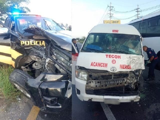 Un aparatoso accidente ocurrido la mañana de este miércoles 7 de agosto, a la altura del kilómetro 9 de la carretera Mérida–Cancún, dejó un saldo de 15 personas lesionadas, luego de que una patrulla de la Policía Estatal chocara de frente contra una combi colectiva de la ruta Acanceh–Mérida.De acuerdo con el reporte preliminar, la unidad oficial número 6783 perdió el control mientras circulaba por la vía, invadió el carril contrario y se impactó directamente contra el vehículo de transporte público. Como resultado, 13 pasajeros de la combi y dos policías resultaron heridos.Paramédicos acudieron de inmediato para brindar atención médica. Cinco pasajeros y los dos agentes fueron trasladados a hospitales cercanos; ninguno fue reportado en estado grave.La Policía Estatal informó que, además, un autobús de transporte de personal que circulaba por la zona también colisionó con la patrulla. Diez de sus pasajeros fueron valorados en el lugar, sin requerir traslado.El tramo comprendido entre los kilómetros 9 y 17 de la Mérida–Cancún es considerado uno de los más conflictivos, debido al crecimiento de empresas en la zona y al aumento del tráfico, lo que ha reducido significativamente la capacidad de la carretera. Navegación de entradasIntentaron huir, pero fueron detenidos tras robo en Umán Mujer de Dzidzantún muere en el baño de su casa en San Francisco Manzanilla