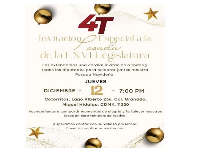 Ciudad de México. El coordinador de Morena en la Cámara de Diputados canceló la posada que se organizó para los integrantes de su bancada, convocada para esta noche en un restaurante de Polanco y donde se reservó lugar para 200 personas con un paquete de mil 100 pesos por cada una.En un mensaje esta tarde, 22 horas después de que se publicó la información al respecto en el portal de este diario, Monreal Ávila sostuvo que Morena no “programó ninguna posada ni fiesta ni festejo”. Dijo que en su partido se actúa “con mucha seriedad, con mucha responsabilidad. Y no es cierto lo que algunos medios han señalado, al menos ninguno de mis compañeros sabe de esta convocatoria, y no la va a haber, se los aseguro”.Incluso manifestó que los diputados de Morena “festejamos con austeridad en nuestra casa, con nuestra familia y con nuestros medios”.Sin embargo, la invitación fue difundida a todos los integrantes de la bancada vía WhatsApp a sus teléfonos móviles, con el mensaje adicional de llevar regalo para un intercambio que se realizaría con el método que utiliza ese partido, la tómbola.En la citada invitación se lee: “4T Invitación especial a la posada de la LXVI Legislatura. Les extendemos una cordial invitación a todas y todos los diputados para celebrar juntos nuestra Posada Navideña. Navegación de entradasPresupuesto garantiza programas, obras y reforma judicial: Sheinbaum Entrada siguiente