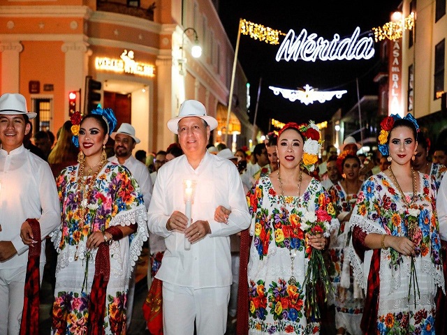 Mérida, Yucatán 6 de enero de 2024.- Acompañado de cientos de meridanos y meridanas, el alcalde Alejandro Ruz Castro encabezó esta noche la tradicional callejoneada, alborada y mañanitas a la ciudad, actividades con las que inician oficialmente los festejos por el 482 aniversario de la fundación de Mérida.En el marco del Mérida Fest 2024 “La Fiesta de la Ciudad, Un Festival Internacional”, decenas de trovadores rodeados de meridanos, meridanas, turistas nacionales y extranjeros, caminaron con entusiasmo desde el parque de Santa Lucía, la calle 60 hasta llegar a los Bajos del Palacio Municipal mientras bellas canciones de trova yucateca amenizaron la celebración a la blanca Mérida.En el derrotero, el Presidente Municipal estuvo acompañado de su esposa Verónica Cetina Arjona, Presidenta del DIF Mérida; Cecilia Patrón Laviada y Katia Bolio Pinelo, diputadas federales; Diana Canto Moreno, Síndico Municipal; Julio Sauma Castillo, Secretario de Participación Ciudadana; Alice Patrón Correa, Regidora Presidenta de la Comisión de Cultura y Espectáculos del Ayuntamiento de Mérida; Irving Berlín Villafaña, Director de Cultura del Ayuntamiento de Mérida.Asimismo, Karem Achach Ramírez, Dafne López Osorio, diputadas locales; regidoras y regidores, directoras y directores municipales.La tradicional alborada se realiza desde el año 1985. En esta ocasión 120 trovadores de las agrupaciones “Guty Cárdenas”, “Pastor Cervera”, “Armando Manzanero” y “Pepe Domínguez” le cantaron a Mérida, en una serenata que incluyó temas tradicionales como Peregrina, En tus ojos, Manos de Arminio, Ciudad Blanca, entre otras. Navegación de entradasYucatán segundo lugar nacional en casos positivos de dengue en el 2023 El alcalde Alejandro Ruz Castro encabeza Sesión Solemne de Cabildo por los 482 años de la fundación de Mérida