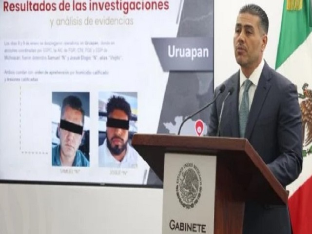 Por Sara Pantoja, domingo, 11 de enero de 2026.-CIUDAD DE MÉXICO (apro).- Fuerzas federales y de Michoacán detuvieron a Samuel “N” y Josué Elogio “N”, alias “Viejito”, por su supuesta participación en el homicidio del presidente municipal de Uruapan, Carlos Manzo; el primero era parte del equipo del alcalde, informó el secretario de Seguridad y Protección Ciudadana (SSPC), Omar García Harfuch.En conferencia, la tarde de este domingo, detalló que el jueves 8 y el viernes 9 de enero se desplegaron operativos en Uruapan para realizar las detenciones, con base en órdenes de aprehensión emitidas por la Fiscalía General de Justicia de Michoacán por los delitos de homicidio calificado y lesiones calificadas.El exjefe de la policía capitalina explicó que, derivado de las investigaciones de gabinete y el análisis de telefonía, se supo que, el día de los hechos, Samuel “N”, quien era director de Relaciones Públicas y Protocolo del municipio, informó a Josué Elogio “N”, un taxista, los detalles del itinerario de Manzo y los movimientos que hacía en torno a la celebración del “Festival de las Velas”, evento en el que “como es evidente, tenían planeado cometer el homicidio”.Detalló que Samuel “N” le informó sobre los retrasos del alcalde y los horarios en que saldría de la Casa de Cultura. De hecho, dijo que fue él quien envió una fotografía donde informa a Josué Elogio “N” que se concentrarían en la explanada.Según García Harfuch, esa información llegó al chat del grupo liderado por Jorge Armando “N”, alias “El Licenciado”, uno de los autores intelectuales del ataque y coordinador de la célula delictiva que realizó la ejecución.Agregó que en aquel momento, Samuel “N” había mantenido comunicación con Ramiro “N”, otro de los involucrados en el crimen. Dijo que el día de la agresión dicho sujeto registró movilidad a 600 metros del lugar de los hechos.La autoridad encontró que Samuel “N” tiene antecedentes penales por lesiones dolosas en el 2007 y robo a negocio en el año 2022.Añadió que, tras la detención de Josué Elogio “N”, el 9 de enero, se hicieron tres cateos en diferentes inmuebles en Uruapan, relacionados con ambos detenidos, donde se aseguró droga y ocho equipos de comunicación, los cuales han dado a las autoridades más indicios para seguir con la investigación.El fiscal general de Justicia de Michoacán, Carlos Torres, añadió que los dos detenidos reconocieron “que ambos conocían del hecho 15 días antes, es decir, dos semanas antes del 1 de noviembre, tanto Samuel como Josué conocían del hecho y del objetivo sobre el homicidio del presidente Carlos Manzo”.Los otros detenidos El secretario García Harfuch destacó que esas dos detenciones se suman a las anunciadas anteriormente: Jorge Armando “N”, alias “El Licenciado”, líder del grupo y uno de los autores intelectuales del crimen. Ricardo “N”, encargado del traslado de los integrantes tras la agresión al presidente municipal. Jaciel Antonio “N”, alias “El Pelón”, reclutador de personas para actividades criminales. Gerardo “N”, colaborador de esta célula y quien tenía comunicación con Jorge Armando “N” y Ramiro “N”. Flor “N”, la autoridad no reveló quién era. Alejandro Baruc “N”, alias “K-OZ”, jefe de una célula generadora de violencia con operación en la región, relacionada con homicidios, extorsión y venta de droga.Según el titular de la SSPC, estas detenciones “debilitan de manera significativa a esta célula criminal generadora de violencia y, al mismo tiempo, impiden que continúe el reclutamiento de jóvenes para actividades ilícitas”.Dijo que las autoridades siguen recabando indicios para continuar la investigación y obtener nuevos hallazgos, mientras que las secretarías de la Defensa Nacional y de Marina, así como la Guardia Nacional, mantienen presencia en Michoacán, así como los operativos y el seguimiento a este grupo criminal para seguir con las detenciones, hasta detener a todos los involucrados.Avances Plan MichoacánEl secretario Omar García Harfuch informó también de los avances obtenidos con el Plan Michoacán por la Paz y la Justicia, del 10 de noviembre de 2025 al 8 de enero de 2026.En ese lapso, dijo, fueron detenidas 378 personas por delitos de alto impacto, se aseguraron armas de fuego, cartuchos, vehículos, 192 artefactos explosivos, 768 kilos de metanfetamina, 28 mil 800 litros y 15 mil 300 kilos de sustancias químicas, precursores químicos para la elaboración de droga. Además, el Ejército inhabilitó 22 campamentos de la delincuencia organizada, así como 50 tomas clandestinas.En la conferencia estuvieron presentes el general Ricardo Trevilla Trejo, secretario de la Defensa Nacional; el almirante Raymundo Pedro Morales Ángeles, secretario de Marina; y el fiscal general del estado de Michoacán, Carlos Torres Piña. Navegación de entradasAlejandro Gertz será embajador de México en Reino Unido, confirma Sheinbaum ‘El Botox’ exige a Sheinbaum y Harfuch la liberación de su esposa e hija: “Es privación de la libertad”