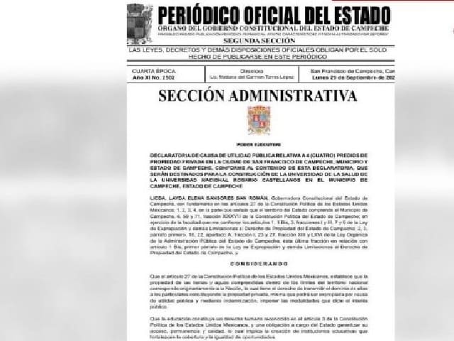 Campeche, Camp. La gobernadora de Campeche, Layda Sansores San Román, anunció la expropiación de cuatro predios de propiedad particular ubicados en el fraccionamiento Miramar, con una superficie total de ocho hectáreas, para la construcción de la Universidad “Rosario Castellanos”, uno de los predios pertenece a Yolanda Cárdenas Montero, madre de Alejandro Moreno Cárdenas, y dos más son de Juan José Salazar, empresario constructor estrechamente vinculado con el también dirigente nacional del PRI.La Secretaría de Gobierno emitió el dictamen técnico jurídico de fecha 26 de septiembre de 2025, a través del cual concluyó que se encuentra plenamente justificada la “causa de utilidad pública” para la construcción de la Universidad de la Salud de la Universidad Nacional Rosario Castellanos.Los interesados tendrán un plazo de cinco días hábiles a partir de la notificación o de la segunda publicación en el Periódico Oficial del Estado de la Declaratoria, para manifestar ante la Secretaría de Gobierno, lo que a su derecho e interés convenga y presenten las pruebas que estimen pertinentes.La Ley de Expropiación del estado de Campeche fue reformada apenas el pasado 3 de septiembre pese a la oposición de diputados de Movimiento Ciudadano y el PRI, quienes consideraron como arbitraria esa medida, pues deja en la indefensión al ciudadano al concederle sólo cinco días para presentar sus alegatos, prolongar por 10 años el plazo para la indemnización que corresponda, y dejar en manos del gobierno la valuación del predio.Pese a que el gobierno del estado negó que esta reforma a la ley fuera a ser utilizada en perjuicio de los ciudadanos, su primera aplicación tiene como objetivo un fraccionamiento privado, el Miramar ubicados en la avenida Resurgimiento.Los terrenos a expropiar pertenecen a Yolanda Mercedes Cárdenas Montero, madre del senador, Alejandro Moreno Cárdenas, dos predios son de Juan José Salazar Ferrer, a quien de acuerdo con versiones de la propia gobernadora, Layda Sansores, se considera como prestanombre del dirigente nacional del PRI.Un cuarto predio, corresponde a Gabriela Castilla Azar y Rafael Arturo Castilla Azar, este último actual titular de la Coordinación General de la Oficina de la gobernadora Layda Sansores. Navegación de entradasMonreal presentará iniciativa para cancelar tarjetas de crédito no solicitadas sin penalización Aprueba San Lázaro prohibir la venta de bebidas “energéticas” a menores de edad