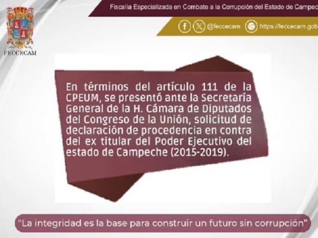 CIUDAD DE MÉXICO (apro) .- El pasado 25 de julio, la Fiscalía Especializada en Combate a la Corrupción del Estado de Campeche (FECCECAM) presentó y ratificó, ante la Cámara de Diputados, una solicitud de declaración de procedencia en contra del exgobernador, Alejandro Moreno.Este martes, la Asociación Mexicanos Contra la Corrupción y la Impunidad (MCCI) resaltó la solicitud de desafuero de la Fiscalía en contra del ahora senador.La asociación detalló que la petición de procedencia contra el exgobernador se presentó el pasado miércoles 23 de julio, ya que al legislador tricolor se le imputan el uso indebido de atribuciones y peculado por el probable desvío de 83 millones 508 mil pesos. También informó que, en las carpetas de investigación, mismas que ya fueron judicializadas, se describen diferentes tipos de corrupción en los cuales Alejandro Moreno Cárdenas, como gobernador de Campeche, podría haber tenido responsabilidad. La asociación detalló que en las investigaciones están relacionadas otras 17 personas, entre ellas exfuncionarios de la administración de Alejandro Moreno, quienes ya fueron vinculados a proceso; incluso, otras dos de ellas incluso obtuvieron un criterio de oportunidad ante la Fiscalía de Campeche para colaborar con las investigaciones. El escrito fue turnado a la Secretaría General de la Cámara de Diputados para que lo envié a la Sección Instructora, que se prevé que discuta retirar el fuero a Moreno en el siguiente periodo ordinario, que comenzará el 1 de septiembre. Navegación de entradasTras solicitud de desafuero, “Alito” Moreno denuncia a AMLO, su hijo y gobernadores de Morena Balconean a diputado de Morena por votar en línea mientras abordaba un avión: “¿Van a Tokio?”