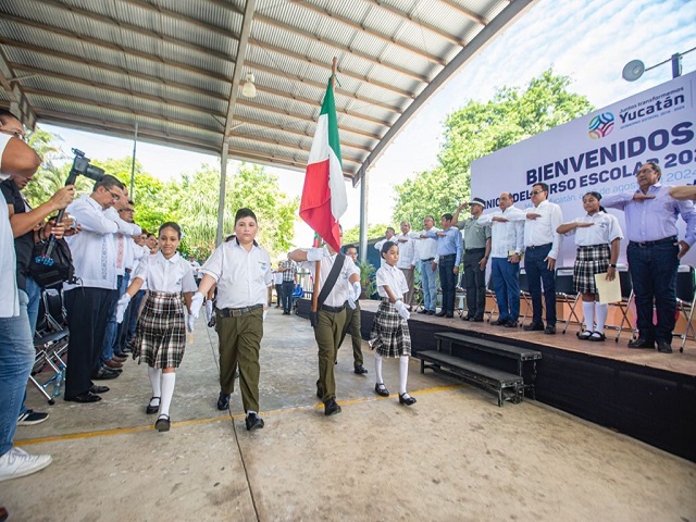 Mérida, Yucatán, a 26 de agosto de 2024.- Más de 500 mil estudiantes de Educación Básica y Media Superior, iniciaron este día el curso escolar 2024 – 2025, retornando a sus escuelas con el entusiasmo del reencuentro y de nuevos aprendizajes. En este marco, en la Escuela Primaria “Solidaridad” ubicada en el fraccionamiento Fidel Velázquez, del oriente de Mérida, se realizó la ceremonia oficial que fue encabezada por autoridades estatales, federales, directores, docentes y padres de familia.De este modo, en presencia de su autor, maestro Luis Pérez Sabido y de parte del equipo de traductores a la lengua maya, Elisa Chavarrea Chim y Edgar Chan Uc, se entonó por primera vez en la historia de la educación pública, la versión renovada del Himno de Yucatán, con el coro de 25 estudiantes de la Escuela Primaria “Nicolás Bravo” y docentes de Educación Artística de nivel primaria bajo la dirección de la maestra Cristina Woodward Campos.Previo a declarar el inicio oficial del curso escolar, el titular de la Secretaría de Educación del Gobierno del Estado de Yucatán (Segey), Liborio Vidal Aguilar, reafirmó el compromiso de la educación como piedra angular en la que se construye un Yucatán más fuerte, inclusivo y próspero para todos.Ante la presencia de los secretarios generales de los seis sindicatos de trabajadores de la educación, de la titular de la Sedeculta, Loreto Villanueva Trujillo y del director del plantel educativo, José del Cármen Vázquez Santos, Vidal Aguilar, refrendó que cada día en las aulas representa una oportunidad única para sembrar las semillas del conocimiento que, con el tiempo, florecerán en un futuro brillante para Yucatán.El funcionario reconoció el trabajo coordinado del Gobierno Estatal con el Gobierno Federal, en el que cada nivel realiza la labor que le corresponde para beneficio de los estudiantes yucatecos. Asimismo, agradeció el invaluable papel de las maestras y maestros, de las madres y padres de familia en la construcción del Yucatán próspero.“Hoy, retornan a las aulas 505 mil 171 estudiantes de todas las escuelas de nivel Básico y Medio Superior, de los cuales 88 mil son de nuevo ingreso”, informó Vidal Aguilar.En su intervención, Carlos Puga Bolio, en representación de la maestra Leticia Ramirez Amaya, destacó la colaboración interinstitucional que siempre ha habido entre la SEP federal con la Segey para brindar mejores oportunidades y herramientas educativas a niñas, niños y jóvenes.De igual modo, subrayó los logros obtenidos con la implementación del plan de estudios de la “Nueva Escuela Mexicana”, que promueve una educación científica, humanista e inclusiva para todos, la entrega de más de 160 millones de Libros de Texto Gratuito en todo el país y la inversión de más de 84 mil millones de pesos en rehabilitación a través de la Escuela es Nuestra.En nombre de sus compañeras y compañeros, Marien Paola Navarrete Góngora, alumna de 6 grado y ganadora de la Olimpiada Estatal de Matemáticas, expresó estar lista para empezar el curso escolar con todo el entusiasmo y la gratitud, que será memorable sobre todo quienes entran a la última etapa de la primaria.“Con el apoyo de nuestros maestros, nuestra familia y las nuevas herramientas lograremos grandes cosas, así que vamos a aprovechar al máximo estas nuevas oportunidades y a trabajar con dedicación para alcanzar nuestras metas”, dijo emocionada.Como parte del evento se hizo entrega de 755 piezas de mobiliario, entre sillas, mesas trapezoidal y mesas para maestros en beneficio de cinco planteles, entre ellos, “Manuel Gutiérrez Nájera”, “Eduardo Urzaiz Rodríguez”, “Damián Carmona”, “Salvador Varela Reséndiz” y la anfitriona, todas de la ciudad de Mérida.Atestiguaron el arranque del curso escolar, José Crescencio Gutiérrez González, presidente de la Comisión Permanente de Educación, Ciencia y Tecnología del Congreso del Estado; Mario Alberto Paredes León, titular de la Oficina de Enlace Educativo de la SEP Federal; Linda Basto Ávila, directora general de Educación Básica; Leonel Escalante Aguilar, director general de Desarrollo Educativo y Gestión Regional; Adlemy Arjona Crespo, directora de Educación Primaria y Carlos Zapata Castillo, Jefe de Sector 02.También, Alejandro Chulim Cimé y BJ Emmanuel Gónzález Chavez, secretarios generales de las secciones 57 y 33, respectivamente del Sindicato Nacional de Trabajadores de la Educación (SNTE); acompañados de Demetrio Rivas Corona y Juan Gabriel Corchado Acevedo, representantes nacionales; Yolanda Góngora Sosa, secretaria general del Sindicato Yucateco de Trabajadores Transferidos de la Educación (SYTTE); Elvira Caamal Vázquez, secretaria general del Sindicato Independiente de Trabajadores de la Educación De México (SITEM); Carlos Angulo Flores, Secretario General del Sindicato Estatal de Trabajadores de la Educación de Yucatán (SETEY); y Flor Arnal González, comisionada estatal del Gremio Nacional de Trabajadores de la Educación (GNTE). Navegación de entradasEl Ayuntamiento de Mérida entrega nuevos espacios públicos que empoderan a la sociedad civil Se instala Comisión de Transición de la Administración Pública estatal