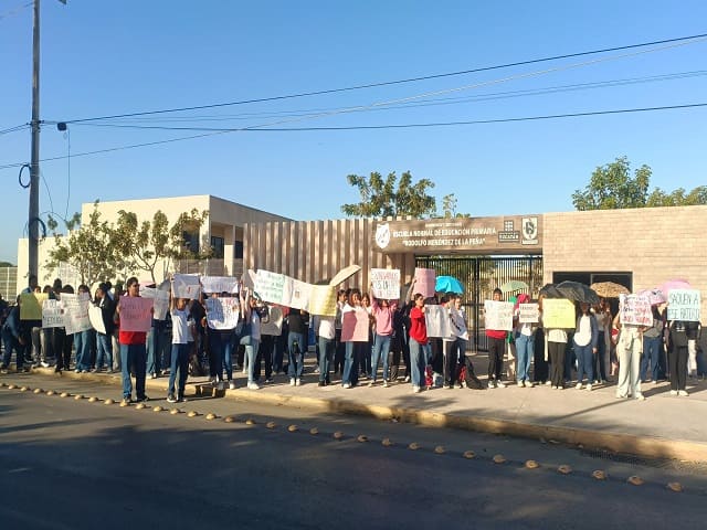 Un conflicto de alta tensión se registra en la Escuela Normal de Educación Primaria “Rodolfo Menéndez de la Peña” (ENEPY), donde alrededor de 250 alumnos mantienen bloqueado el acceso principal del plantel como medida de protesta. Los estudiantes exigen la destitución inmediata del director, Hilario Leoncio Vélez Merino, a quien señalan por presuntas prácticas autoritarias al interior de la institución.Desde tempranas horas, los manifestantes cerraron el paso sobre la calle 61, generando afectaciones a la vialidad y manteniendo una protesta permanente. Los normalistas denunciaron públicamente una serie de irregularidades que, aseguran, se han normalizado bajo la actual administración del plantel.De acuerdo con el pliego petitorio, el director es acusado de abuso de autoridad, manipulación de procesos internos, hostigamiento y conductas misóginas contra el alumnado. Asimismo, los estudiantes afirman que existen casos de acoso laboral y represalias académicas y administrativas contra quienes cuestionan decisiones de la dirección.Los inconformes sostienen que alumnos y docentes han sido dados de baja de manera arbitraria por no “alinearse” a las órdenes del directivo, lo que, aseguran, ha generado un clima de miedo e incertidumbre dentro de la escuela formadora de docentes.Los manifestantes informaron que ya existe una mesa de diálogo instalada; sin embargo, advirtieron que no liberarán el acceso al plantel hasta que una comisión de la Secretaría de Educación del Estado acuda personalmente y se concrete la remoción del director.Mientras tanto, el ambiente en las inmediaciones de la ENEPY permanece bajo vigilancia constante. Los estudiantes reiteraron que no retrocederán en su demanda y mantendrán el bloqueo hasta obtener una respuesta concreta de las autoridades educativas.ACOM Navegación de entradasCecilia Patrón supervisa instalaciones de Ciudad Carnaval para una fiesta inclusiva y segura Cobrar sí, hostigar no: Ramírez Marín propone frenar el acoso de despachos de cobranza