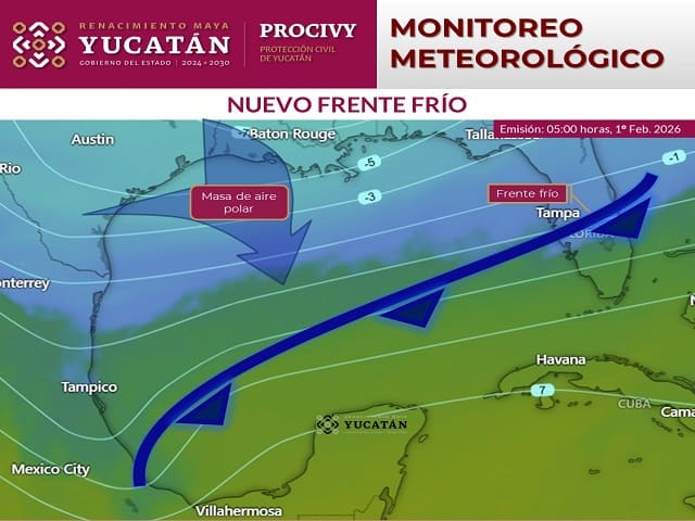 Mérida, Yucatán, a 1 de febrero de 2026.-El Gobierno del Estado, a través de la Coordinación Estatal de Protección Civil (Procivy), informa que durante la tarde del 5 de febrero se prevé el ingreso de un frente frío a la Península de Yucatán, seguido por una masa de aire polar, lo que mantendrá un ambiente frío en la región hasta el 10 de febrero. El titular de Procivy, Hernán Hernández Rodríguez, explicó que, de acuerdo con el análisis del Centro Estatal de Monitoreo y Alertamiento, este sistema frontal generará un evento de “norte” de intensidad leve a moderada, con rachas de viento de 45 a 55 km/h en la zona costera y de 25 a 35 km/h en el interior del estado. También se prevé oleaje de 2 a 3 metros y lluvias ligeras a moderadas durante su desplazamiento.Posteriormente, detalló, la masa de aire polar favorecerá un ambiente cálido durante el día y frío durante las madrugadas y amaneceres.Se esperan temperaturas máximas de 28 a 31 °C y mínimas de 11 a 14 °C en municipios del interior del estado, así como de 15 a 18 °C en la zona costera, sin descartar valores cercanos a 10 °C en áreas rurales y con mayor cobertura vegetal, principalmente en el sur de la entidad.Hernández Rodríguez indicó que las zonas más vulnerables ante este evento son los municipios del sur y suroeste, así como las comunidades rurales, por lo que recomendó tomar precauciones.Asimismo, exhortó a la población a abrigarse adecuadamente, evitar cambios bruscos de temperatura, proteger a niñas, niños, personas adultas mayores y mascotas, y atender las recomendaciones para la navegación en la costa.Finalmente, informó que Procivy mantiene vigilancia permanente y dará seguimiento a la evolución de este sistema, con actualizaciones oportunas a través de los canales oficiales. Navegación de entradasContinua Cecilia Patrón entregando trabajos de rehabilitación vial en comisarías del sur Concluye la pesca del mero e inicia la veda 2026 en Yucatán