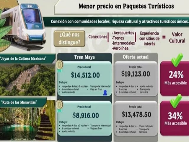 Existen diez opciones de viaje con vuelos incluidos, actividades culturales Durante la conferencia mañanera de este miércoles, Óscar David Lozano, director general del Tren Maya, presentó una actualización sobre el avance de este proyecto, así como detalles sobre paquetes turísticos, rutas y precios para la temporada de verano.Uno de los anuncios más destacados fue la reciente renovación de la Estación Tenosique, ubicada en Tabasco, que se había mantenido pendiente.Esta parada, que conecta a Tenosique con Balancán, ofrece a residentes y turistas la posibilidad de viajar hasta Palenque, Chiapas, y conectar con el resto de las rutas del Tren Maya, que abarca un total de 1,554 kilómetros a través de cinco estados del sureste mexicano.Con la renovación de esta estación, ya son 34 las estaciones en funcionamiento en el proyecto, lo que confirma el avance significativo del Tren Maya. Además, Lozano destacó la importancia de la infraestructura para el impulso del turismo y la conexión de diversas regiones del país.El director del Tren Maya también informó que el próximo 20 de julio se inaugurará el Tren Ligero de Campeche, una nueva ruta que se enlazará directamente con el Tren Maya, el Aeropuerto Internacional Ingenerio Alberto Acuña Ongay y el sistema de autobuses urbanos “Ko´ox”.Durante los primeros días de funcionamiento, del 20 de julio al 1 de agosto, el servicio será gratuito, y a partir del 2 de agosto se cobrará una tarifa comercial de 18 pesos por traslado.Además, las personas con movilidad reducida, así como estudiantes, recibirán un descuento del 50%.Lozano también presentó los paquetes turísticos que estarán disponibles este verano, con un total de 10 opciones que se podrán disfrutar entre julio y agosto.“Entre pirámides y palmeras”: 6 días y 5 noches, del 17 al 22 de julio o del 14 al 19 de agosto. Costo: 24,821 pesos mexicanos.“La Tierra del Jaguar”: 4 días y 3 noches, del 19 al 22 de julio o del 16 al 19 de agosto. Costo: 18,828 pesos mexicanos.“Entre Lagunas y Leyendas”: 4 días y 3 noches, del 22 al 25 de julio o del 5 al 8 de agosto. Costo: 16,873 pesos mexicanos.“Corazón del Mundo Maya”: 5 días y 4 noches, del 22 al 26 de julio o del 19 al 23 de agosto. Costo: 18,606 pesos mexicanos.“Mares y Lagunas”: 4 días y 3 noches, del 26 al 29 de julio o del 9 al 12 de agosto. Costo: 17,840 pesos mexicanos.“Un Tesoro Maya”: 6 días y 5 noches, del 31 de julio al 5 de agosto. Costo: 22,132 pesos mexicanos.“Alma Libre del Caribe”: 4 días y 3 noches, del 2 al 5 de agosto. Costo: 17,946 pesos mexicanos.“Raíces del Mayab”: 5 días y 4 noches, del 7 al 11 de agosto. Costo: 19,270 pesos mexicanos.“Ruta de las Maravillas”: 4 días y 3 noches, del 9 al 12 de agosto. Costo: 17,031 pesos mexicanos.“Corazón de los Antiguos”: 5 días y 4 noches, del 12 al 16 de agosto. Costo: 20,059 pesos mexicanos.Todos los paquetes incluyen vuelos desde el Aeropuerto Felipe Ángeles con Mexicana de Aviación, y aterrizan en distintos puntos de la Península de Yucatán para realizar actividades turísticas en sitios emblemáticos.Además, Lozano destacó que en todos los paquetes se ofrecerán experiencias de turismo comunitario, promoviendo el contacto directo con las comunidades locales y la riqueza cultural de la región.Los interesados pueden adquirir los paquetes a través del sitio web oficial del Tren Maya, www.trenmaya.gob.mx, o bien, comunicándose a los siguientes medios de contacto:Correo electrónico: ventas.trenmaya@defensa.gob.mxTeléfono: 55 9771 1000WhatsApp: +52 55 7200 0052 Navegación de entradasSan Bruno: la franja doraga que enfrenta a Progreso y Dzemul Proteger a las y los yucatecos: el nuevo reto del sistema de transporte
