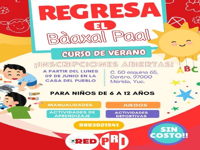 Mérida, Yucatán, 9 de junio de 2025.-A partir de hoy están abiertas las inscripciones para el curso de verano “Bàaxal Paal”, que en lengua maya significa “jugar niño”. Se trata de un programa impulsado por gobiernos priistas, que el próximo año cumplirá 30 años de brindar actividades formativas y recreativas a miles de niñas y niños yucatecos.Este año, el curso se llevará a cabo en la Casa del Pueblo, con el respaldo del Comité Directivo Estatal del PRI. El dirigente estatal, Gaspar Quintal Parra, recordó que el programa inició en 1996, durante la administración del entonces gobernador Víctor Cervera Pacheco (q.e.p.d.), y desde entonces ha representado un espacio seguro y educativo durante las vacaciones escolares.“El Bàaxal Paal ha sido un programa exitoso que responde a una necesidad real de las familias trabajadoras, a diferencia de los gobiernos actuales que no cumplen con sus compromisos sociales”, expresó Quintal Parra.La organización de esta edición corre a cargo de la Red Jóvenes por México Yucatán, presidida por Salvador Orozco Rodríguez, y coordinada por Joseph Chi Rodríguez, quienes han preparado una agenda de actividades educativas, culturales, deportivas y recreativas, en un ambiente seguro y de convivencia.“Este curso representa el regreso de los buenos tiempos, cuando los gobiernos pensaban en la gente y sus verdaderas necesidades. Hoy retomamos una tradición con sentido social, identidad y compromiso”, afirmó Orozco Rodríguez.El curso está dirigido a niñas y niños de entre 6 y 12 años de edad, es gratuito y se realizará del 12 al 25 de julio, de lunes a viernes, en un horario de 9:15 a 13:00 horas, en la sede priista.Las inscripciones estarán abiertas del 9 de junio al 10 de julio. Para registrarse o solicitar más información, las personas interesadas pueden comunicarse al 999-302-1541 Navegación de entradasEl sargazo amenaza el Caribe mexicano con cifras históricas Cecilia Patrón reconoce 22 años de labor de la Policía Municipal
