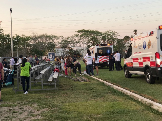 Cuando menos 10 personas heridas, entre ellas varios niños dejó el desplome de unas gradas luego de ser chocadas por una camioneta, durante un partido de fútbol en los campos de la Universidad Marista en Temozón Norte.Los hechos que movilizaron a los cuerpos de emergencia de la Secretaria de Seguridad Pública, ocurrieron está tarde del jueves en las instalaciones deportivas.Se pudo averiguar que se estaba desarrollando un partido de fútbol, padres de familia e hijos estaban presentes apoyando a sus equipos en las gradas ubicadas en la parte poniente del campo.Cuando de repente el conductor de una camioneta tipo Jeep, al entrar por la parte trasera de las gradas, en vez de frenar se confundió y aceleró, provocando el accidente.Por el impacto las gradas cedieron y se vinieron abajo con todo y gente, por lo cual quedaron con golpes y cortaduras. Otra versión es que las gradas cedieron por el mal estado.Rápidamente directivos de la Universidad Marista ubicada a un costado del periférico de Mérida, dieron parte a las autoridades de la Secretaria de Seguridad Pública que enviaron varias ambulancias.Los paramédicos atendieron a cuando menos diez personas, entre ellas niños, dos de los heridos ameritaron el traslado médico a clínicas particulares.En el sitio de manera prepotente llegó el señor Antonio Cámara, que sin identificarse como directivo, maestro o ex alumno de dicho centro educativo trató de impedir la labor periodística.Hasta ahora la Universidad no ha emitido algún comunicado sobre lo acontecido está tarde en sus instalaciones. Navegación de entradas¡Unidos, mejorando y defendiendo a Yucatán ganaremos esta Elección!: Renán Barrera El Ayuntamiento refrenda su compromiso de ofrecer servicios de recolección de basura