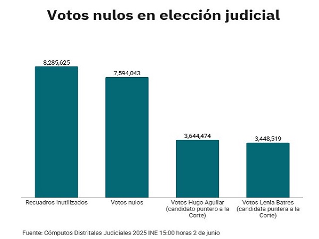 Por Ariadna Ortega de Expansión Política.-Los votos nulos en la elección judicial superan hasta ahora el número de sufragios obtenidos en conjunto por los candidatos Hugo Aguilar Ortiz y Lenia Batres Guadarrama, quienes lideran –con el 67.8% de las actas computadas– las votaciones a ministros de la Suprema Corte de Justicia de la Nación (SCJN).De acuerdo con el cómputo distrital del Instituto Nacional Electoral (INE), hasta las 15:00 horas sumaban 7 millones 594,043 votos nulos, mientras que Aguilar Ortiz registraba 3 millones 644,474 y Batres Guadarrama 3 millones 448,519.Es decir, que los votos nulos también fueron grandes protagonistas en los primeros comicios para elegir a los juzgadores en el país.Mariana Campos, directora general de México Evalúa, señaló en la mesa de análisis de Expansión Política que contabilizar los votos nulos es un factor clave que se suma a la baja participación ciudadana, pues consideró que muchos de los votantes acudieron a anular su voto como forma de protesta.“Me parece muy importante que de esta participación del 11% se contabilicen los votos nulos. Es clave porque a lo mejor hay personas que no creen en el proceso, pero fueron –como un modo de protesta– a anular su voto”, señaló.Hasta el corte de las 15:00 horas, la participación ciudadana de la elección para ministros se situaba en 11.5%, abajo de la estimación general del INE, que fue en el rango de 12.57 y 13.32%.Votos nulos, cinco veces más que los registrados en 2024El número de votos nulos registrados en este proceso es cinco veces mayor que este tipo de sufragios registrados en la elección presidencial de 2024, cuando se contabilizaron 1.4 millones.La complejidad de las boletas derivó también en más de ocho millones de votos que se consideran como no utilizados, es decir, que la boleta no tiene marcas ni registros en las zonas de los cuadros que permitan identificar con claridad el sentido del sufragio.Al respecto, la consejera electoral Carla Humprey explicó que, si alguien no llenó los recuadros en la boleta de ministros a la Suprema Corte, esos recuadros no utilizados invalidan o anulan toda la boleta. “Esos recuadros no se toman como voto nulo, sino como recuadro o espacio no utilizado”, precisó.En total, sumaban hasta las 15:00 horas 15 millones 879,668 votos anulados y “recuadros que no se utilizaron”, lo que contrasta con la comparación que hizo la presidenta Claudia Sheinbaum de los votos obtenidos por partidos de oposición en los pasados comicios.En su conferencia de prensa de este lunes, celebró la participación de alrededor de 13 millones personas en este primer ejercicio democrático y aseguró que son más votos que los que obtuvo el PAN, PRI y Movimiento Ciudadano en la elección federal de 2024.“El PAN tuvo 9.6 millones de votos; el PRI 5.7 millones y Movimiento Ciudadano 6.2 millones. O sea, por ellos votan menos de los que votaron por el Poder Judicial, pues con razón están muy preocupados”, dijo.No obstante, solo se refirió a las personas que asistieron a votar, lo que no se traduce en número votos emitidos. Navegación de entradasA veces se aprende más de los tropezones: Nahle sobre Morena en elecciones de Veracruz Hugo Aguilar Ortiz encabeza las preferencias entre los aspirantes a la Suprema Corte